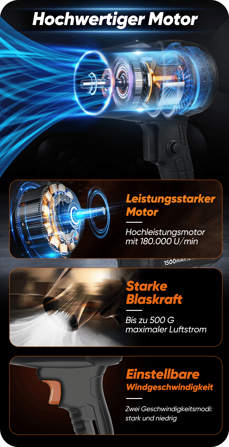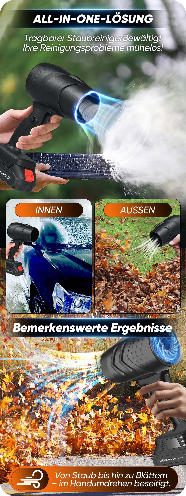Er ist unglaublich vielseitig! Sie können ihn zum Entstauben, Blasen von Blättern, Entfernen von Schnee und vielem mehr verwenden, was ihn zu einem Muss für verschiedene Reinigungsaufgaben im Haus und Auto macht.